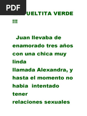 A menudo cuando alguien se siente incómodo al usar la palabra sexo la reemplaza por intimidad. Que es la vueltita verde. LA VUELTITA VERDE Juan llevaba de enamorado tres años con una chica muy linda llamada Alexandra y.